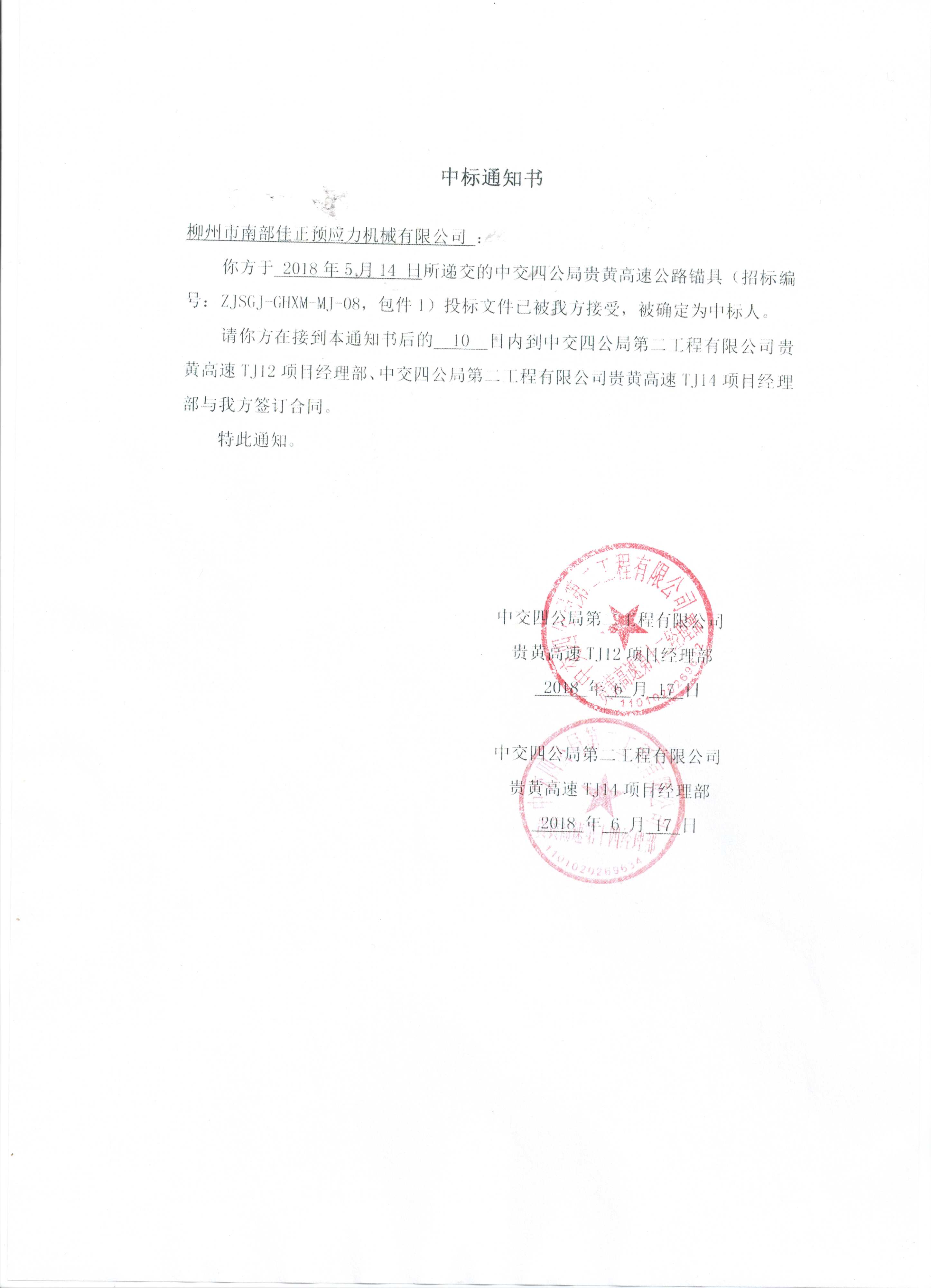 貴黃錨具中標(biāo)通知書