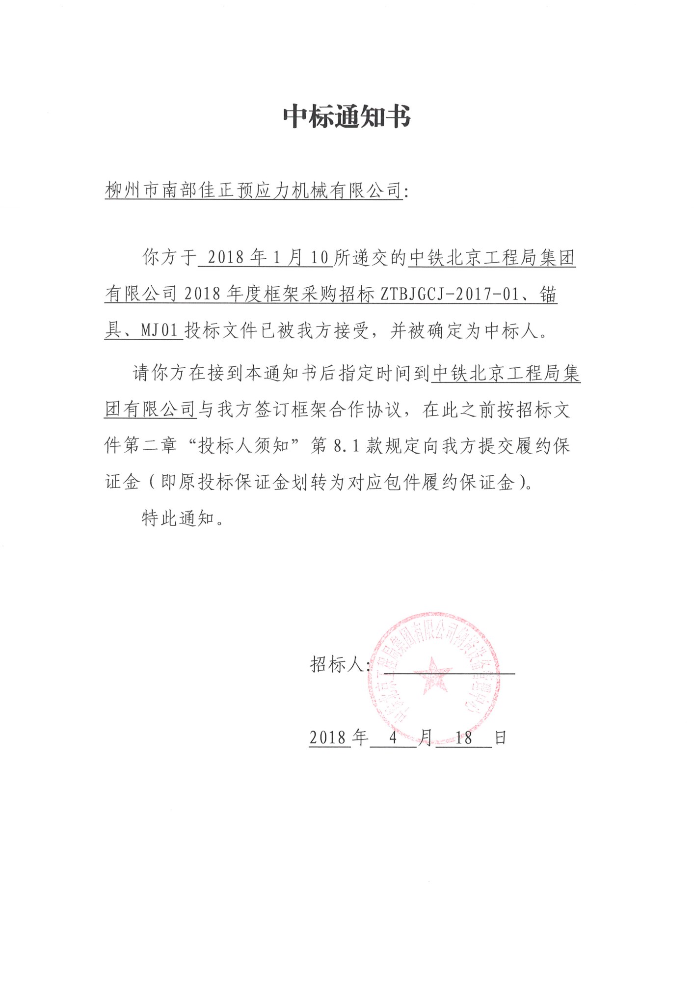 中鐵北京工程局框架采購中標(biāo)通知書