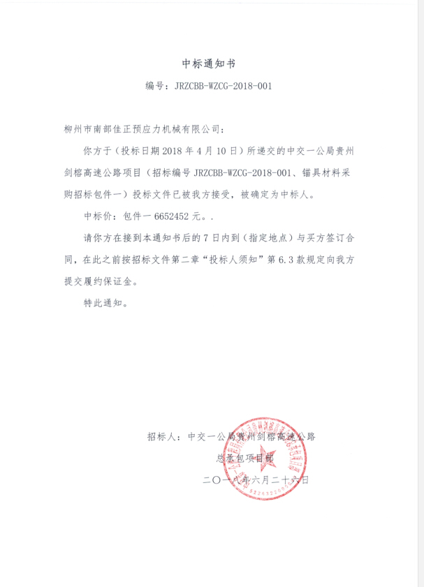 劍榕南部佳正錨具中標(biāo)通知書